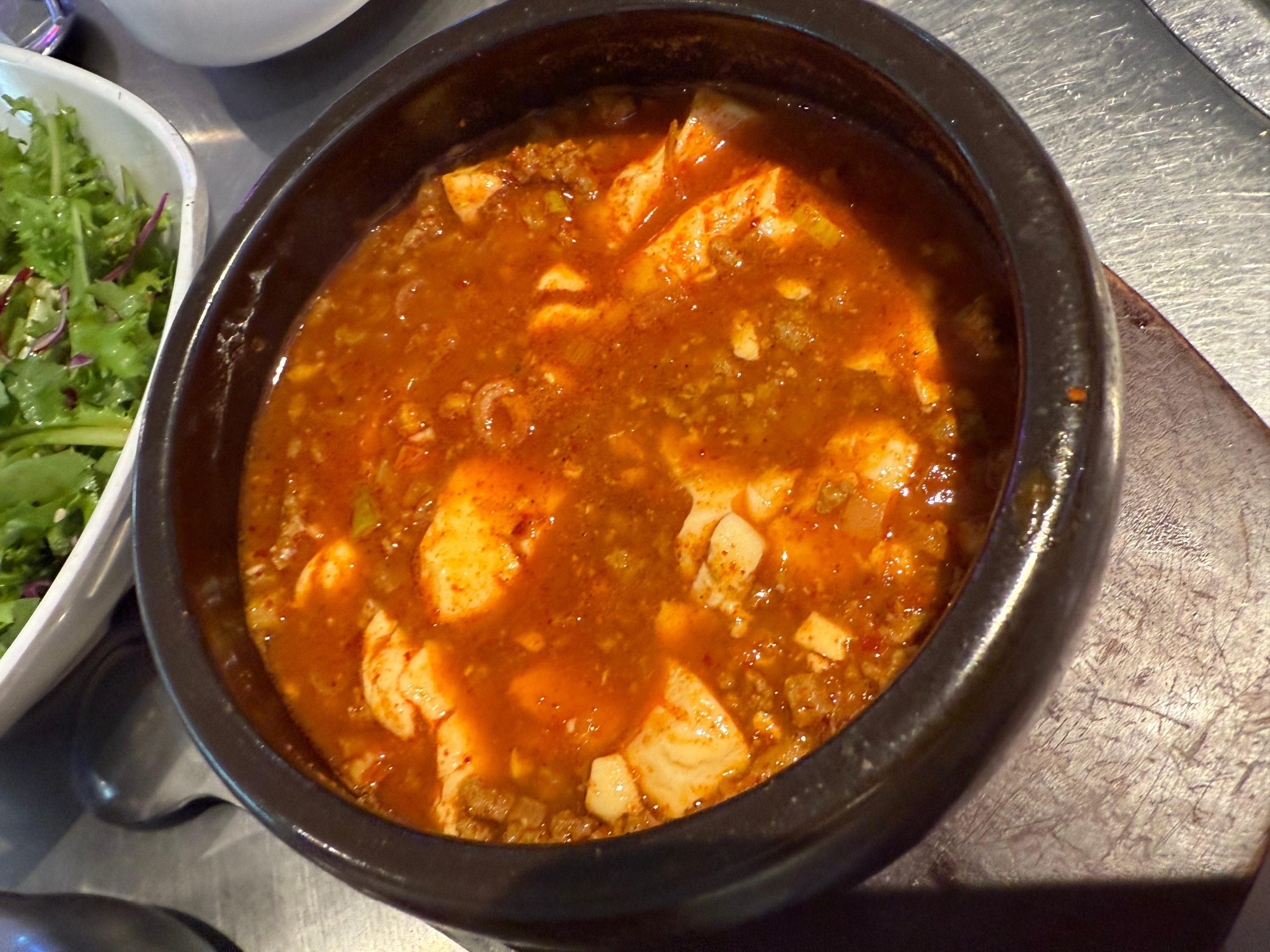 순두부찌개는 얼큰하면서도 순두부의 부드러움이 살아있어 고기와 함께 먹기 완벽한 조합이었어요. 다진 고기가 듬뿍 들어있어서 고기맛이 진한 순두부찌개였어요.