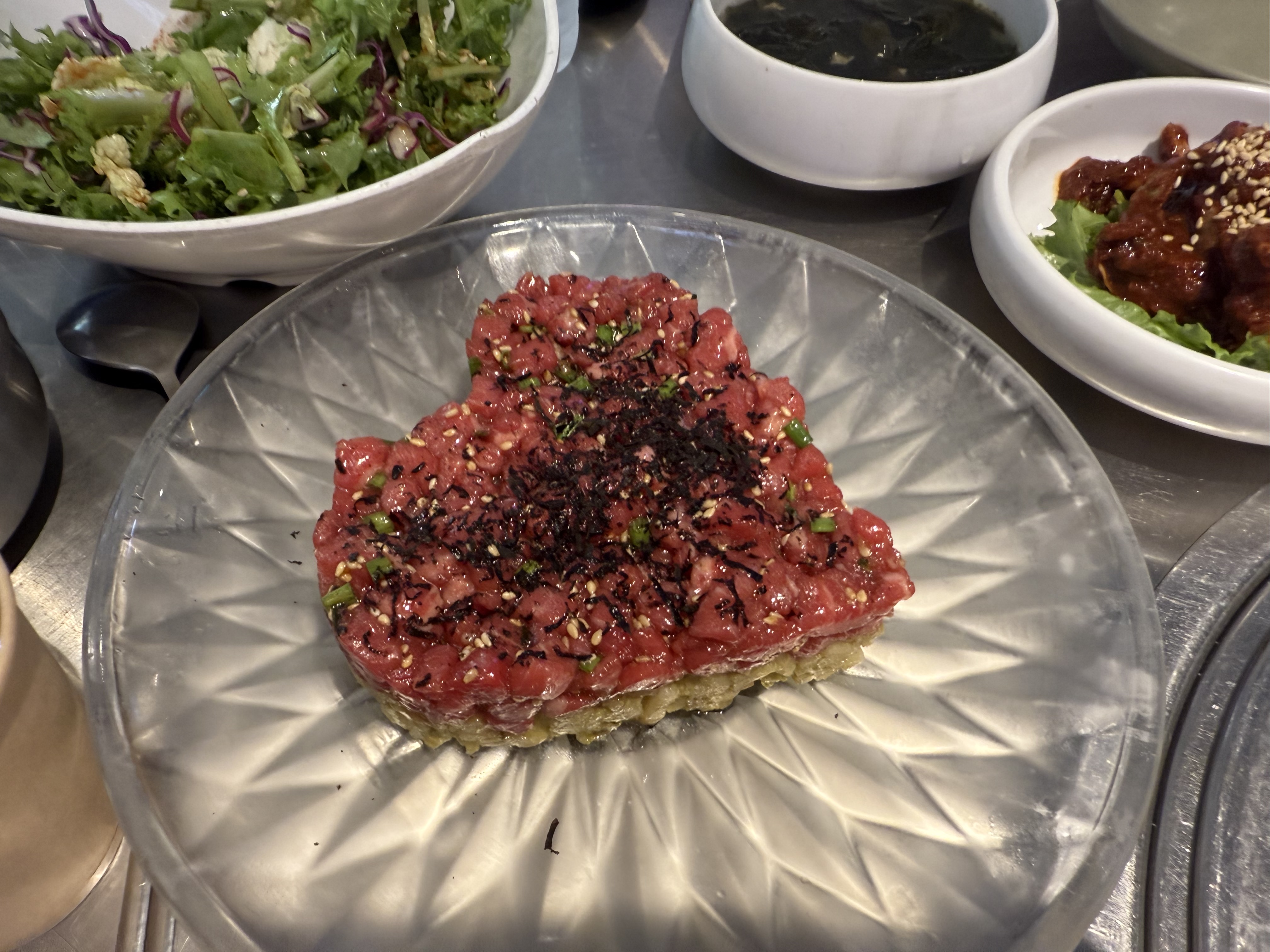 신선한 육회는 고기 본연의 맛을 제대로 느낄 수 있었어요. 아보카도와 배 위에 올린 육회는 입에서 살살 녹는 부드러움과 고소함이 정말 좋았습니다. 아이들도 몇 점 맛보더니 맛있다고 하더라고요.